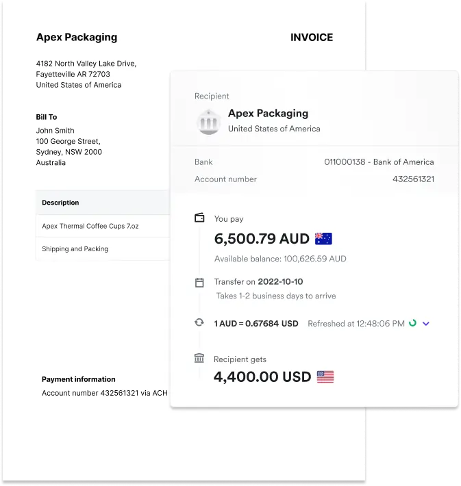 Pay bills directly in multiple currencies at competitive FX rates, all without the hassle of manually inputting payment details into your bank.