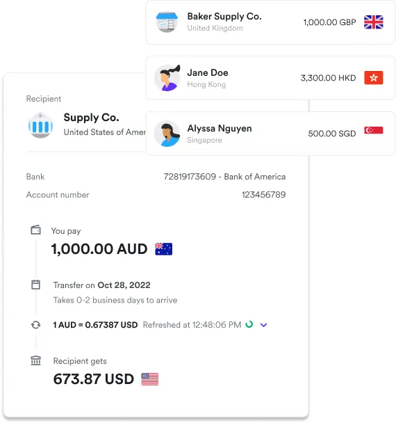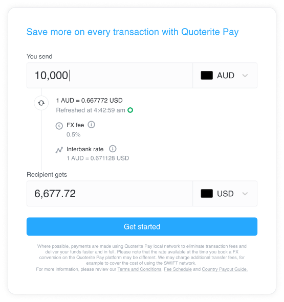 An international money transfer is a money transfer to a recipient bank outside of your domestic country. You don’t need to open a business account with a bank in a foreign country to send a payment overseas. With QuoteritePay powered byAirwallex, you can easily make fast one-time or recurring international transfers in multiple currencies at bank-beating FX rates.