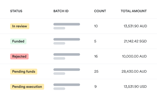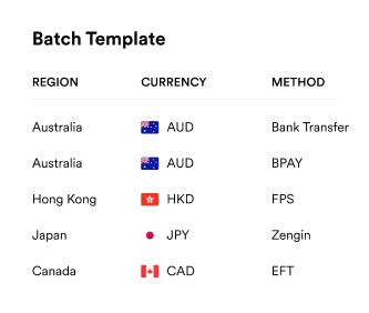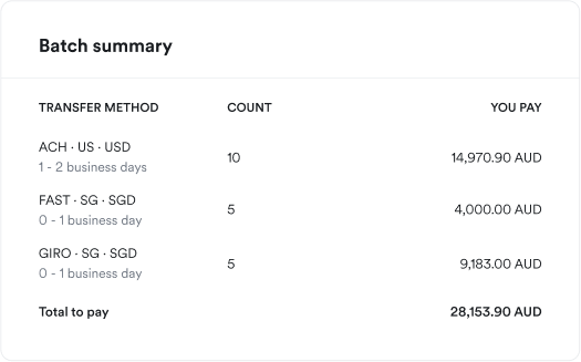 Execute batch transfers to 1,000 recipients globally, across various currencies and methods.