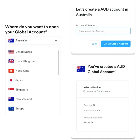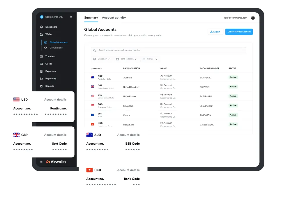 Global Accounts function as local currency accounts in your name, complete with local bank and branch codes and dedicated account numbers. They simplify receiving funds both domestically and internationally into your Quoterite Pay powered by Airwallex account from various countries and regions. Get all the tools you need to manage money globally, without the complications of a traditional bank.