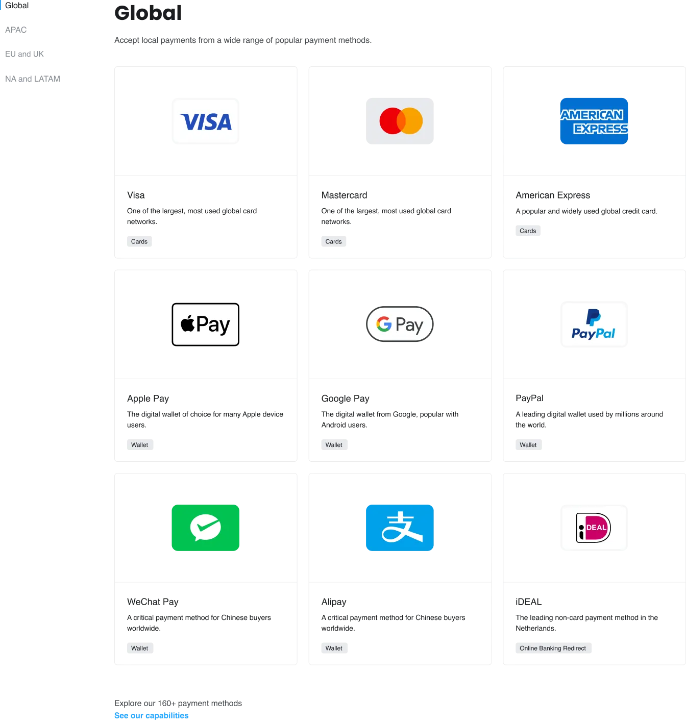 Accept payments from customers in over 180 countries and regions through a wide range of payment methods, including popular local options.